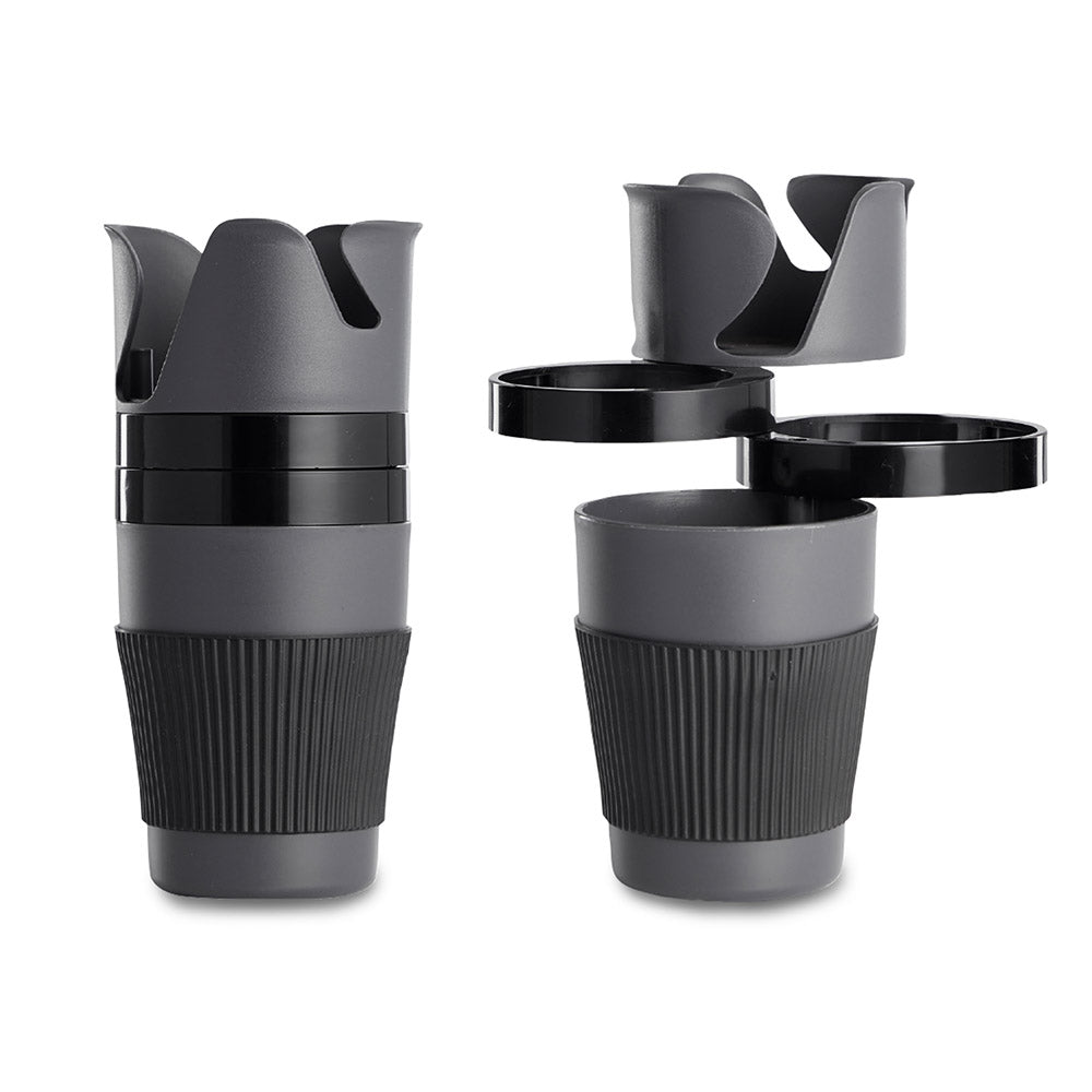 5 en 1 : un support téléphone, un support lunettes, 2 porte-gobelet et un vide poche.