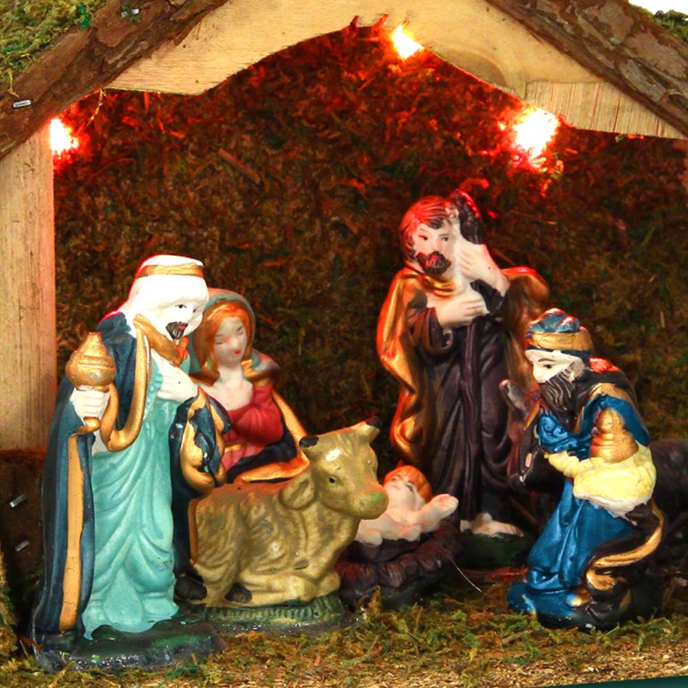 Déjà prête ! Crèche lumineuse 5 LED, complète avec 8 santons en porcelaine.