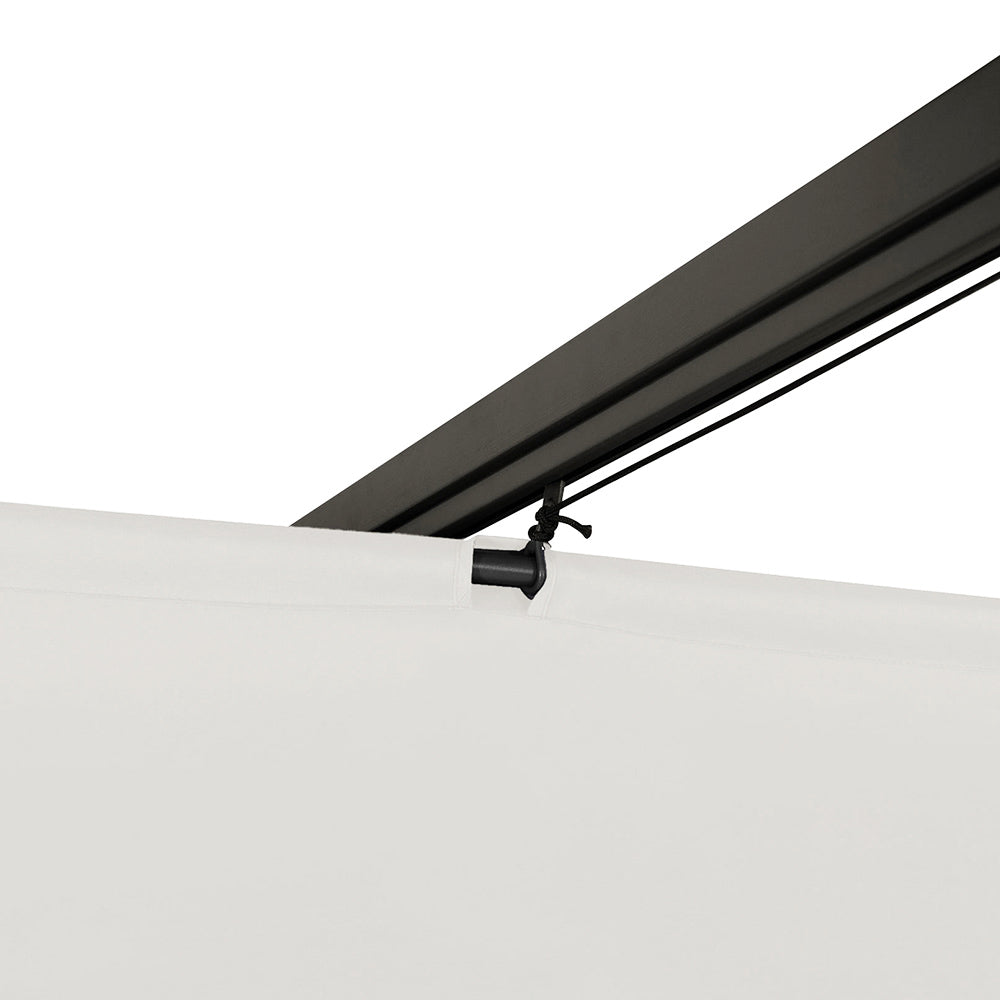 Toile fixée sur des barres coulissantes pour ajuster l'ombre. La toile se fixe à l'aide d'une cordelette sur les montants de la pergola.