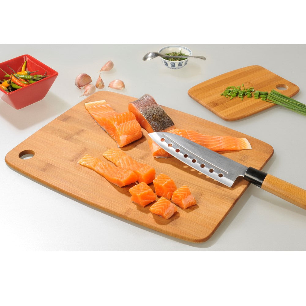 À la différence d'une planche en bois traditionnelle, la planche en bambou résiste mieux aux marques de couteaux et à l'eau.