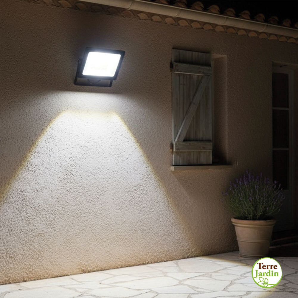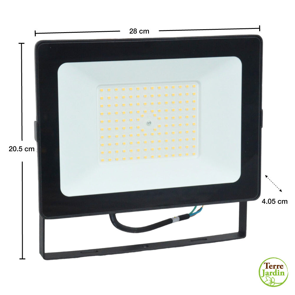 Projecteur LED extérieur 100W diffusant 10 000 lumens en blanc chaud avec un angle d’émission 120°. Ce projecteur est idéal pour éclairer efficacement jardins, façades ou garages. Il également facile à installer sur mur ou sol.