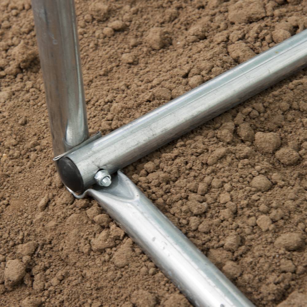Détails matière : bâche renforcée en polyéthylène et structure en acier galvanisé.